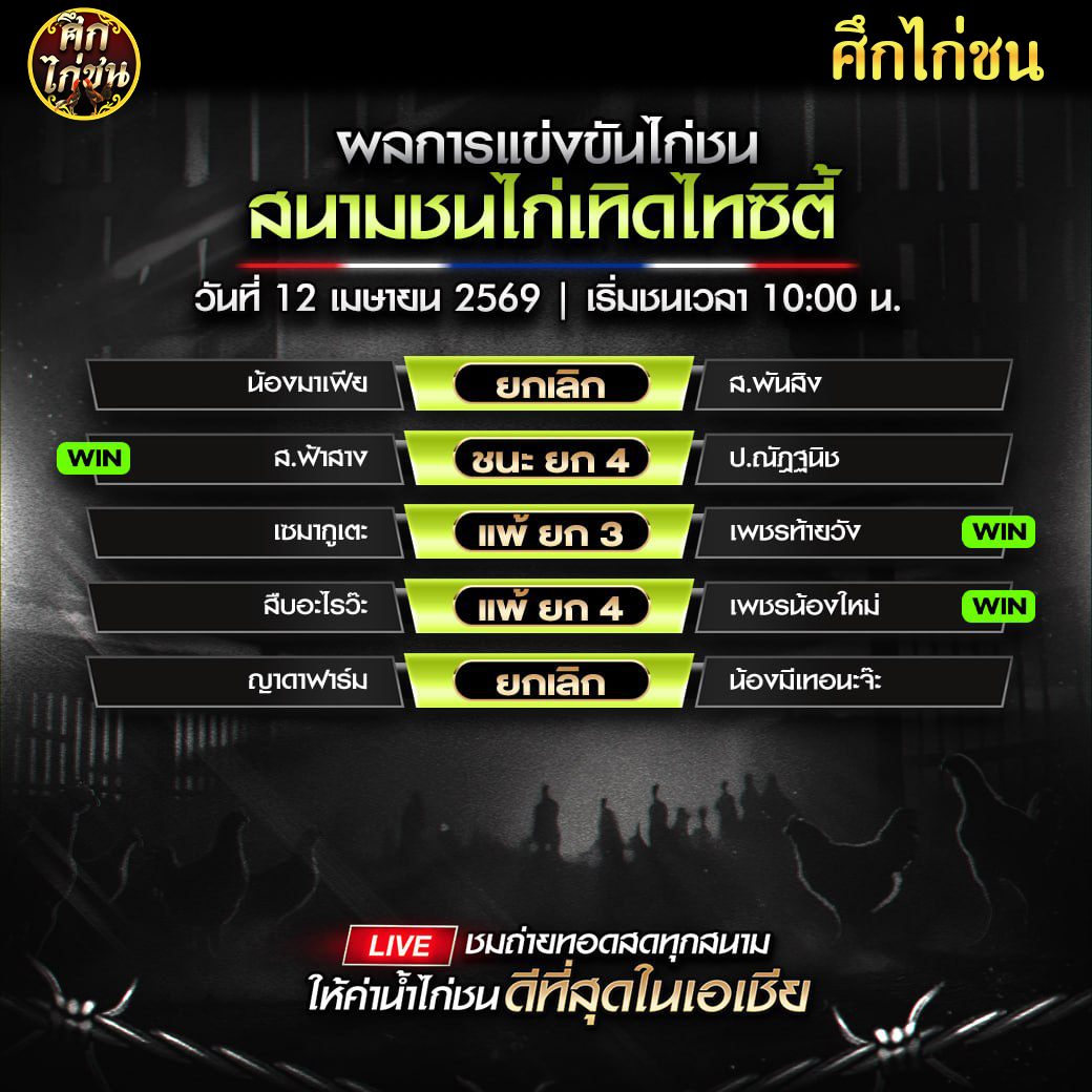 สรุปผลไก่ชน วันที่ 12/4/2569 สนามชนไก่เทิดไทซิตี้