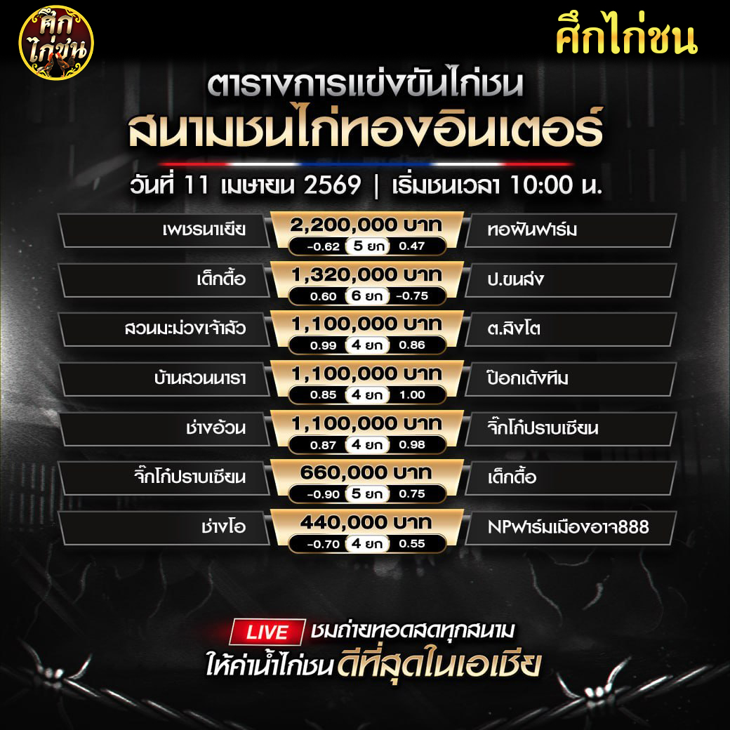 ตารางการแข่งขันไก่ชน (สนามชนไก่มหาลาภ) เสาร์ที่ 11 เมษายน 2569 (เวลา 10:00 น.)